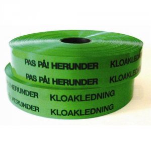 Markeringsbånd grøn 500m, 50mm bred, *PAS PÅ! HERUNDER KLOAK*For markering af underliggende rørledninger.