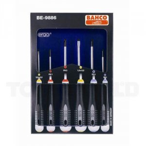 Skruetrækkersæt 6 dele LI/PH/PZ, Ergo, Bahco BE-9886. Finish Forkromet, højglanspoleret klinge. Materiale: Klinge af VANADIUM EKSTRA. Sæt indeholdende 6 stk. skruetrækkere med hhv. 2 stk. lige, 2 stk. Phillips® og 2 stk. Pozidriv® kærv. Ergonomisk, 3-komponent skaft af polypropylen og termoplastisk elastomer.