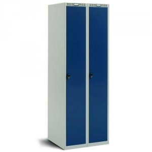 Garderobeskab med 2 søjler med en bredde på 300 mm. Designet er enkelt og funktionelt med flad top, skjulte hængsler og dørgreb for hængelås. Kraftigt dørstop med en maksimal åbningsvinkel på 90gr der forhindrer, at døren går op i naboskabet.