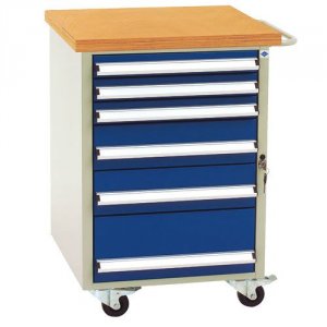 Montagevogn SS 1.6 på hjul med multiplex bordplade og kørehåndtag. Lågen er forstærket enkeltpladet. Vognen kan udbygges med bl.a. galvaniseret hylde, gummimåtte eller udtrækshylde - se tilbehør nedenfor.