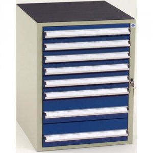 Skuffeskab SS 1.8B med letløbende skuffer, lejret i skinner med stålkugler og med 100% udtræk. Skufferne er udstyret med skuffespærre. Toppen er som standard udstyret med en riflet gummimåtte. Skabet har i alt 8 skuffer - 2 stk. på 132 mm. og 6 stk. på 66 mm. i højden.