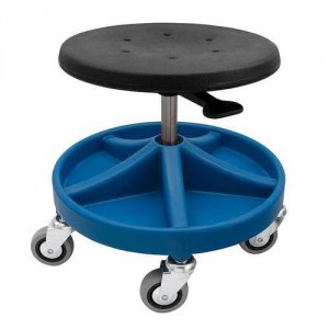 Blå montørstol/taburet med sæde i pu-skum, fodkryds med 5 rum, 5xø75 hjul og højde 350-470 mm