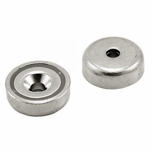 Flad pottemagnet indkapslet i stålkappe med stærk neodymium magnet og undersænket skruehul. Stålkappen øger magnetens samlede magnetisme. Pottemagneten finder bred anvendelse til mange forskellige industrielle formål.