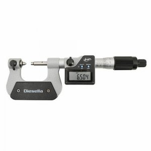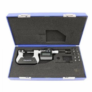 Digital mikrometer til udvendig måling af gevinddiameter med udskiftelige V-formede og kegleformede indsatser. Måleområde 0-25 mm.