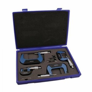Solide udvendige mikrometerskruer måleområde 0-100 mm. Sæt a 4 stk. Matforkromet og med måleflader ihårdmetal og lakeret bøjle. Kontrolmål medfølger - det mindste er 25 mm. Aflæsning: 0,01 mm.