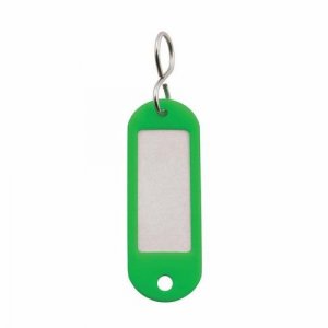 Grøn nøglering i plast med skrivefelt, med S krog.