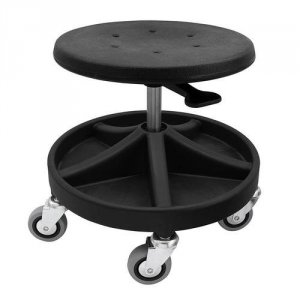 Sort montørstol/taburet med sæde i pu-skum, fodkryds med 5 rum, 5xø75 hjul og højde 350-470 mm
