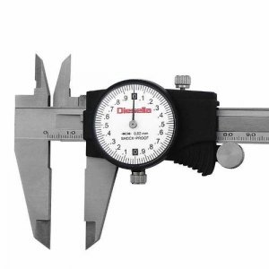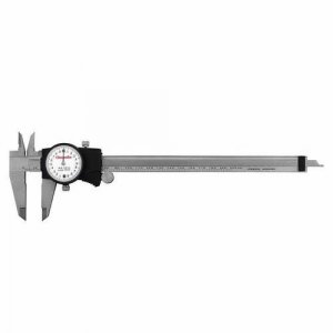 Solidt skydelære med hvidt præcisionsur, drejelig urskive og skruelås. Med stødbeskyttelse og beskyttet tandstang.