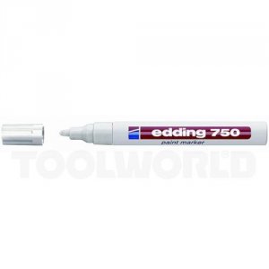 Hvid Metalmarker Edding 750. Paint marker med permanent tyktflydende blæk, som tørrer glansfuldt op ligesom maling på tætte overflader. Velegnet til glas, metal, glanspapir og lignende glatte overflader.