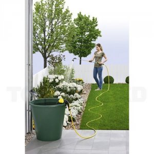 Kärcher har lavet denne praktiske pumpe hvor man kan pumpe vandet fra sin regnvandsbeholder direkte ud til bedene. Pumpen er udstyret med en flyde mekanisme så den automatisk slukker når regnvandsbeholderen er tømt. Pumpen aktiveres med en stor drejekontakt, meget synligt så men ikke er i tvivl om pumpen er tændt eller slukket. Med quick koblingerne er det meget nemt at af- og på montere vandslange.