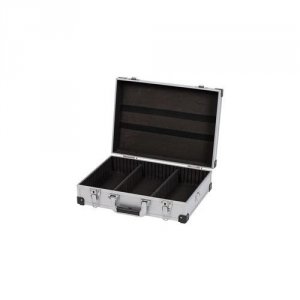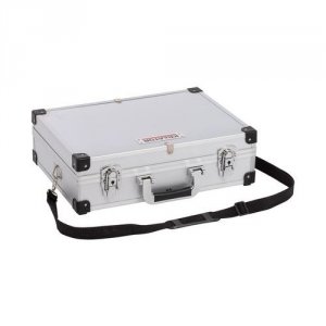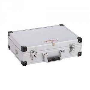 Sølv aluminiums kuffert med målene 420 mm x 300 mm x 125 mm.