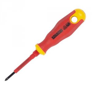 VDE godkendt skruetrækker med Pozidriv PZ0x60 mm kærv fra Kreator. Når du arbejder med el under spænding er det nødvendigt at benytte en VDE godkendt skruetrækker. Godkendt IEC 60900:2004.
