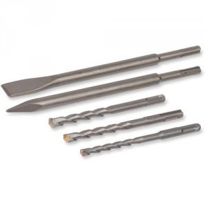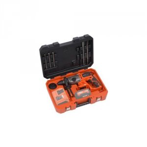 Borhammeren leveres i en praktisk kasse med fri plads til batteri og oplader. Det inkluderer 3 bor, 1 spids og 1 flad mejsel.
