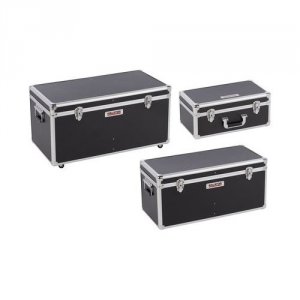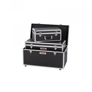 De robuste, men alligevel lette kasser måler 475x260x210 mm, 680x310x320 mm og de største 730x380x360 mm. Metalhjørnerne gør sagerne endnu mere robuste. Du kan nemt bære dem overalt takket være det glatte metalhåndtag på den mindste kasse eller let flytte dem ved hjælp af sidehåndtag og hjul. Den indvendige polstring sikrer også sikker transport. Endelig kan KRT640501B-sagerne også låses med to nøglelåse, og du får to nøgler. Disse sager findes kun i sort.