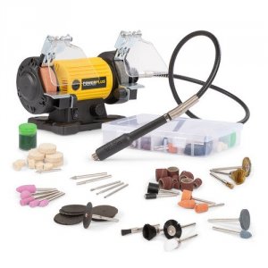 Powerplus bænksliber med 2 stk. poler/slibesten Ø 75 mm og et fleksibelt skaft på 1 meter samt 103 tilbehørsdele. Du har altså alt, hvad du behøver for at komme i gang med det samme.