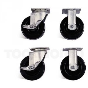 Hjulsæt til JOBMASTER opbevaringskasse Knaack Nr 32, Nr 42 og Nr 60. Sættet består af 4 stk. 100 mm solide polypropylen hjul som monteres under Rigid Jobmaster kassen.
