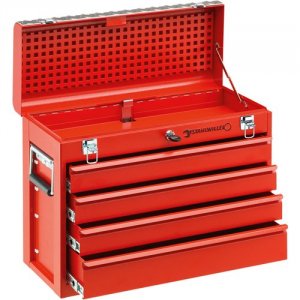 Værktøjskasse med 4 skuffer og et fag under låget, sikkerhedslås og stabilt aluminiumsstruktublik på låget