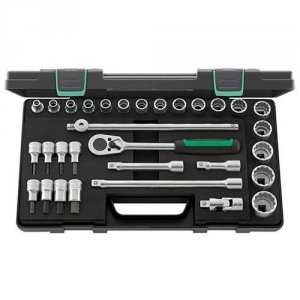 Topnøglesæt 50/54/25/6 med 31 dele fra tysk Stahlwille. Sættet består af almindelige toppe i millimeter med dobbelt sekskant profil (12-kant), og toppe med skruetrækkerhoved INHEX (unbrako).