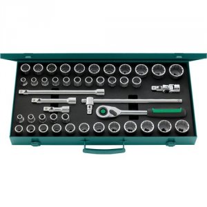 - 39 topnøglehoveder med dobbelt sekskant nr. 50 (10, 11, 12, 13, 14, 15, 16, 17, 18, 19, 120, 21, 22, 23, 24, 25, 26, 27, 28, 30, 32 og 34mm) og nr. 50a (3/8", 7/16", 1/2", 9/16", 19/32", 5/8", 11/16", 3/4", 25/32", 13/16", 7/8", 15/16", 1", 1 1/16", 1 1/8", 1 3/16" og 1 1/4")