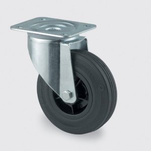 Hjulfælg: Polypropylen, Hjulbane: Massiv sort gummi, rulleleje, Pladebefæstigelse.