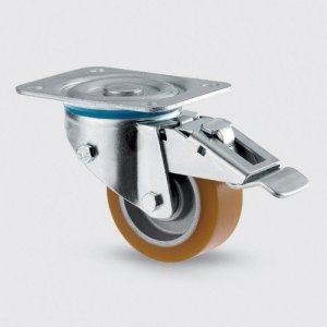 Drejeligt transporthjul med bremse+rund bane, polyuretan, 100 mm