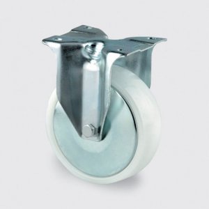 Faste hjul, Gaffel fremstillet af presset stål, forzinket, blåpassiveret, hjulaksel med møtrik, Pladebefæstigelse.