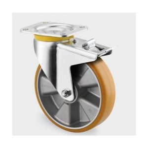 Fast hjul, Gaffel af kraftig presset stålplade, forstærket, gul-kromatiseret, hjul boltet i gaffel, Hjulfælg: Aluminium, Hjulbane: Polyuretan, DIN-kugleleje, Pladebefæstigelse.