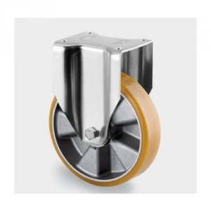 Fast hjul, Gaffel af kraftig presset stålplade, forstærket, gul-kromatiseret, hjul boltet i gaffel, Hjulfælg: Aluminium, Hjulbane: Polyuretan, DIN-kugleleje, Pladebefæstigelse.