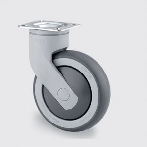 Hjulfælg: Polypropylen, Hjulbane: TENTEprene, grå termoplastisk gummi, afsmitningsfri, DIN-kugleleje, med trådfang, Pladebefæstigelse.