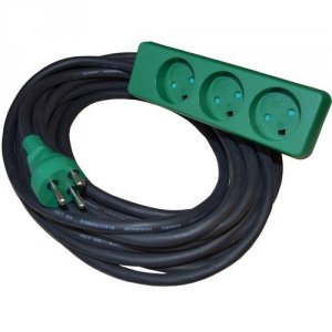 Monteret med 25 m neoprenkabel 3G1,5 mm² og dansk stikprop med jord. Slagfast trestikdåse med jord